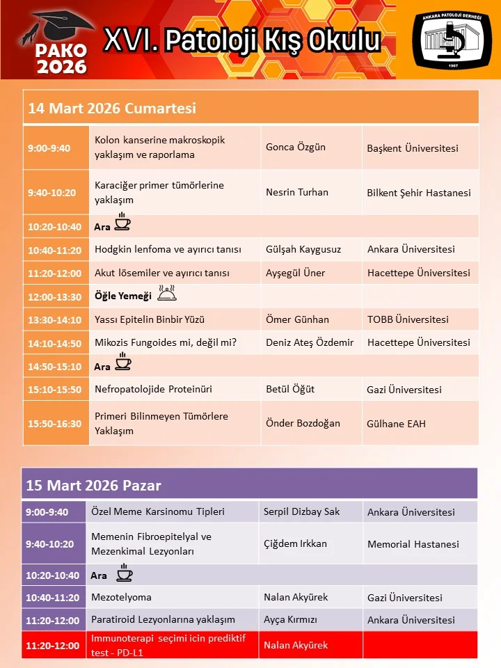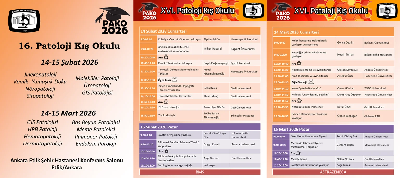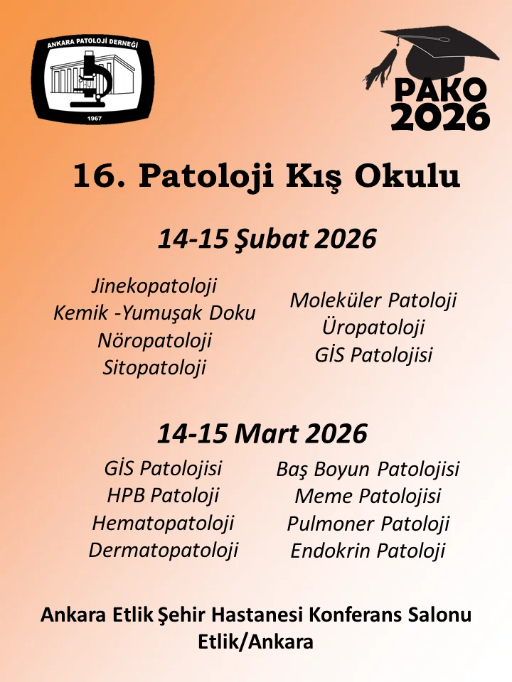 2012’den itibaren Ankara Patoloji Derneği tarafından her yıl gerçekleştirilen, uzman ve uzmanlık öğrencilerine yönelik olarak hazırlanan Patoloji Kış Okulu, bu sene birincisi 14-15 Şubat 2026 ve ikincisi 14-15 Mart 2026 tarihlerinde olmak üzere Etlik Şehir Hastanesi Konferans Salonu Etlik/Ankara’da yapılacaktır.